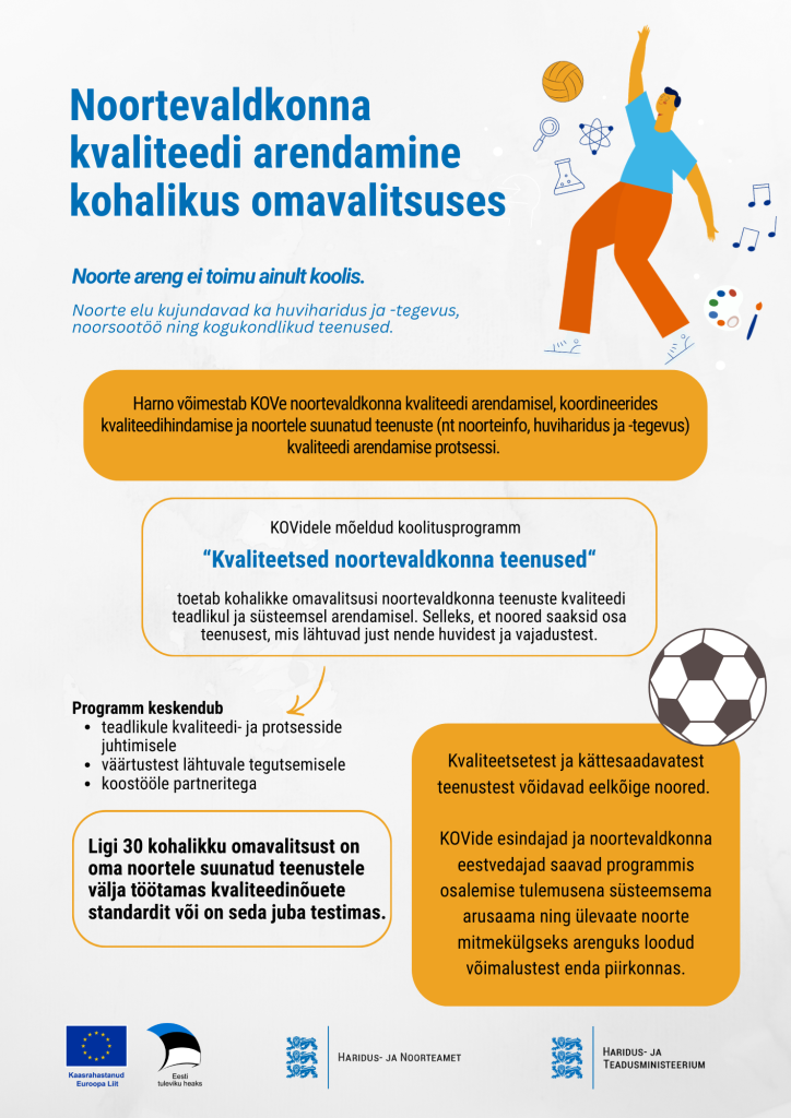 Samas ei teki kvaliteetsed teenused juhuslikult. Nende arendamine eeldab teadlikku juhtimist, väärtustest lähtuvat tegutsemist ja koostööd erinevate partneritega. Just need teemad on olnud fookuses koolitus- ja arenguprogrammis „Kvaliteetsed noortevaldkonna teenused“, mille raames on juba ligi 30 kohalikku omavalitsust oma noortele suunatud teenuste kvaliteedile välja töötanud standardi või on seda juba testimas.