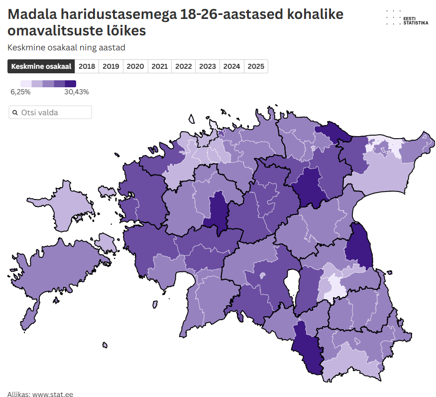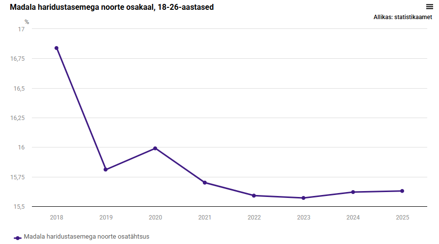 Statististikamet analüüsis haridus- ja noorteameti tellimusel madala haridustasemega 18–26-aastaste noorte osatähtsust viimase kaheksa aasta (2018–2025) jooksul. Madala haridustasemega noorena käsitles analüüs neid noori, kes ei ole omandanud keskharidust ega ole seda ka omandamas.
