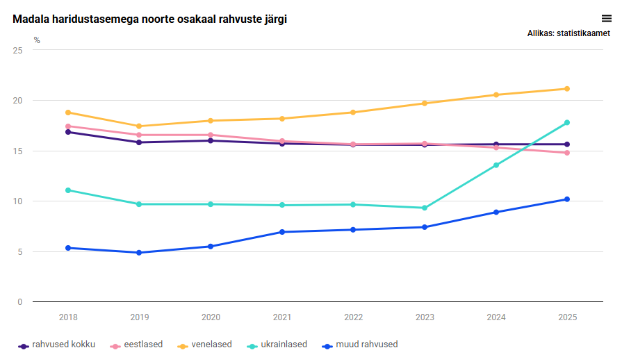 Madala haridustasemega vene noorte osakaal on kogu vaadeldava perioodi jooksul olnud kõrgem kui kõigi noorte peale kokku ning on tõusuteel. 2025. aastal on kõigist 18–26-aastastest venelastest madala haridustasemega 21,2% (noorte keskmine on 15,6%). „Kõigist muudest rahvusest noorte puhul paistab silma üldisest oluliselt väiksem osakaal madala haridustasemega noori, kuid ka nende seas on keskhariduseta noorte osa viimase paari aastaga hoogsalt tõusnud – 2018. aastal 5,3%, 2023. aastal 7,4% ning 2025. aastal 10,2%,“ kirjeldas Lass.