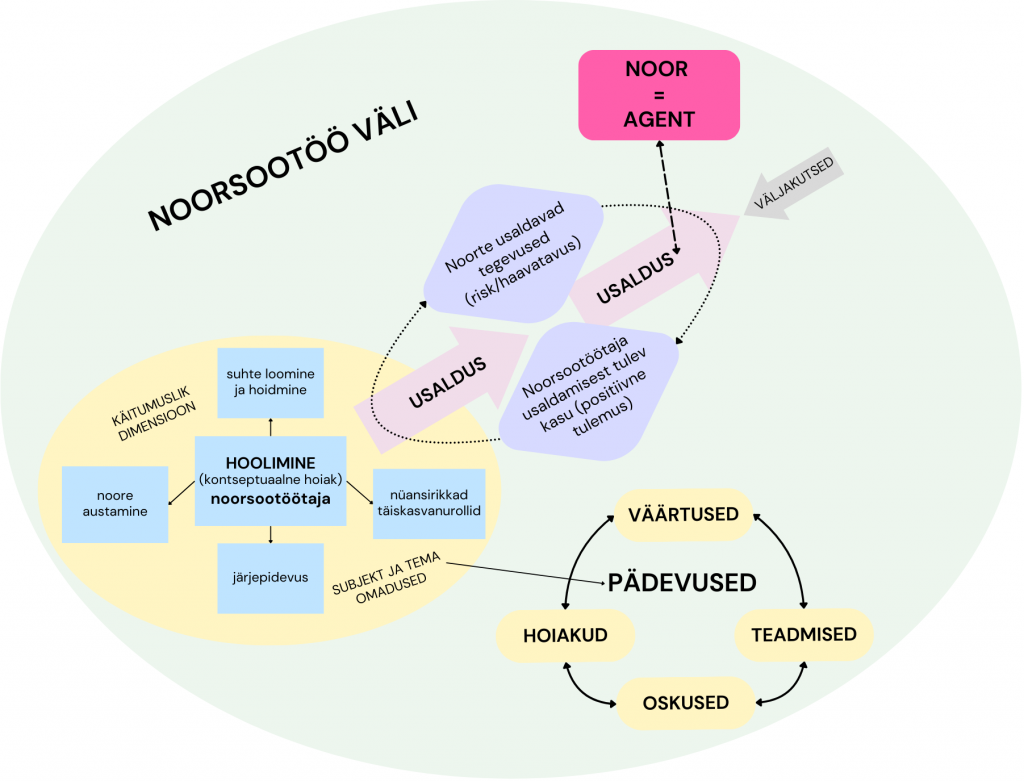 Usaldus eeldab noorsootöötajalt hoolivat käitumist, mis on järjepidev, noort austav, täidab noore elus nüansirikkaid täiskasvanurolle ning loob ja hoiab suhteid. Tähtsad on noorsotöötaja pädevused ehk teadmised, oskused, hoiakud ja väärtused ning noorsootöötaja omadused ja tegevused. Usalduse tekkimisel avab noor ennast enam, mis võib kaasa tuua positiivse protsessi ja tulemused: avaldub noore agentsuses* [5] ehk noorel tekib valikuvabadus, võime teha otsuseid, praktiliselt tegutseda ning ka vastutust kogu protsessi eest võtta. Noorsootöötaja kui kvalifitseeritud professionaal on ainulaadses positsioonis, sest tal on võtmeroll usalduse loomisel, parandamisel ja hoidmisel. Läbi selle tekib noorel võimalus ise oma reaalsust avastada[6].