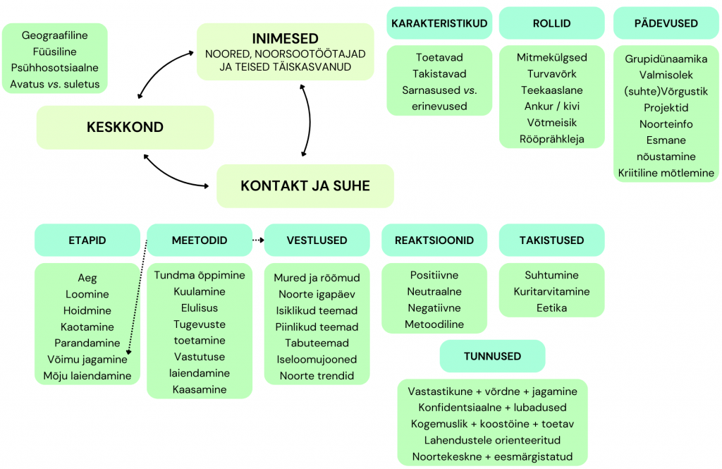 Kontakt ja suhe seovad inimesed ning keskkonnad ühtseks tervikuks. Noorsootöötaja ülesandeks on võtta initsiatiiv kontakti loomisel ja võtta ning anda aega, et usaldusel oleks võimalik tekkida ja kasvada. Hea noorsootöötaja pagasis on mitmeid meetodeid, mis usalduslikku suhet luua aitavad, sest noorte jaoks on olulisel kohal individuaalne tundma õppimine ja vastutuse laiendamine, laiemate noortetrendide mõistmine, aktiivne kuulamine, tugevuste toetamine, kaasamine ning eluliste praktiliste tegevuste pakkumine. Tähtsaimaks meetodiks on vestlused, kus noortel on võimalik oma muredest, rõõmudest, igapäevaelust, isiklikest ja piinlikest, k.a tabuteemadest rääkida.